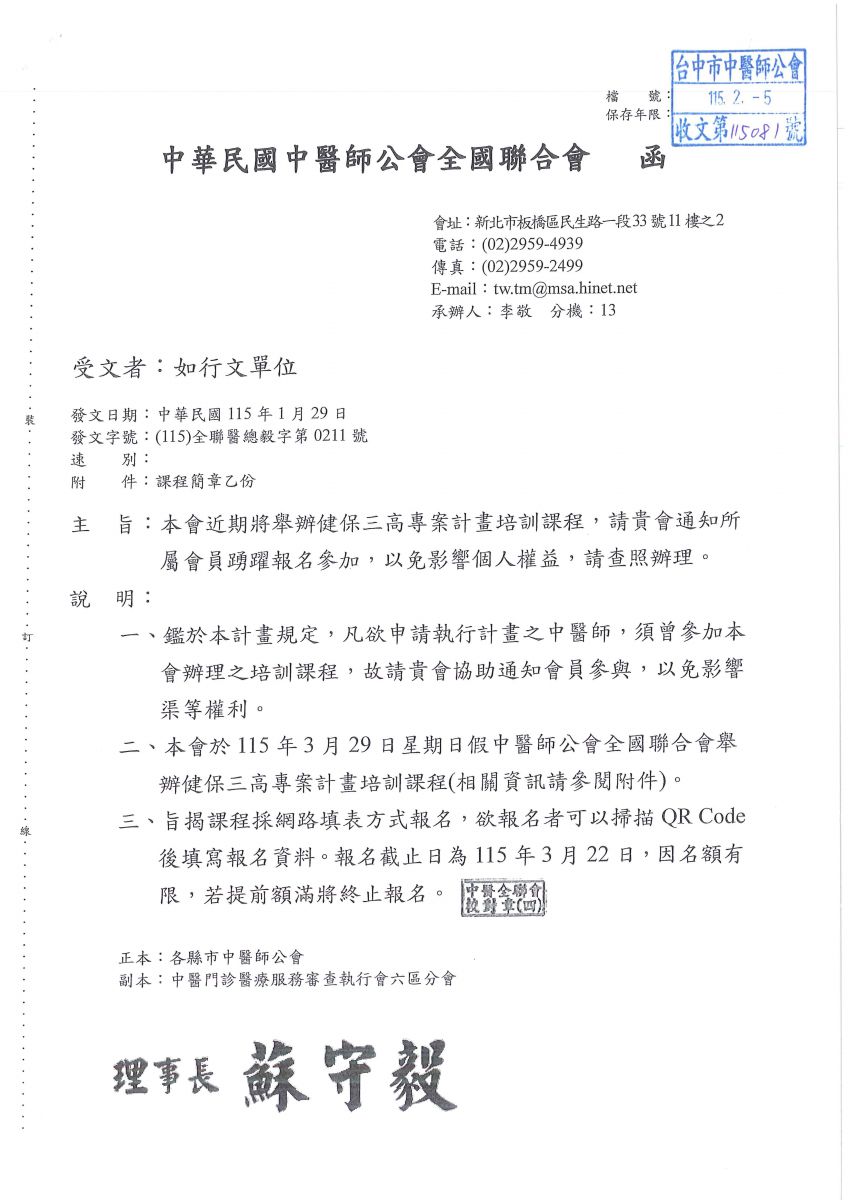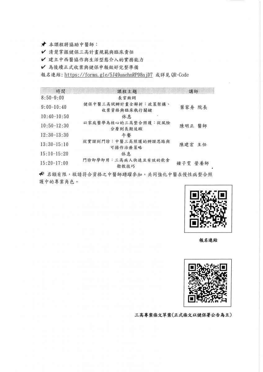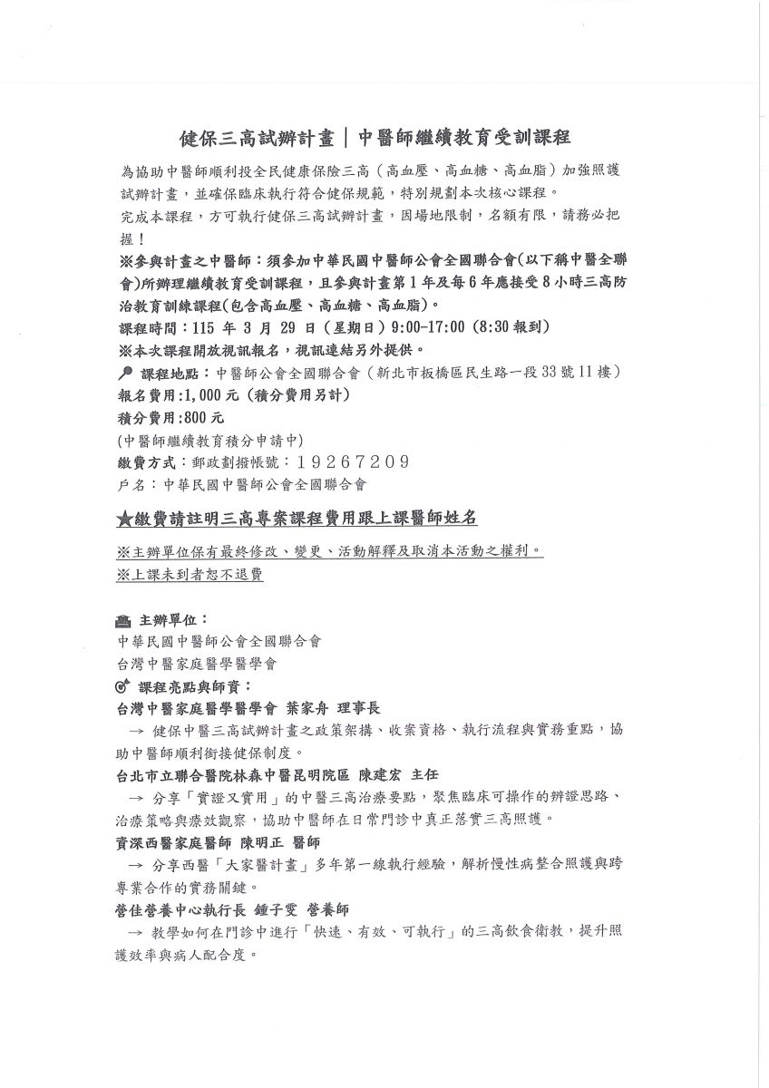 中醫師全聯會:全聯會近期將舉辦 健保三高專案計畫培訓課程,請會員踴躍報名參加。