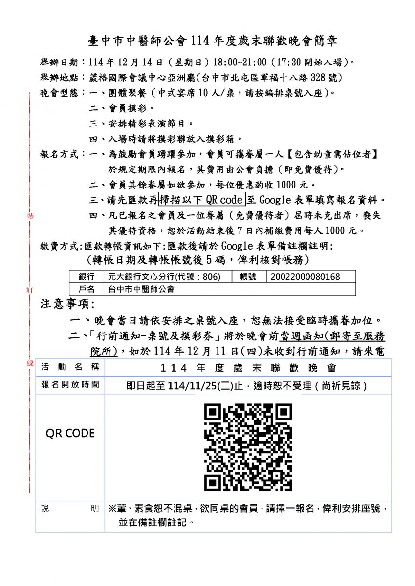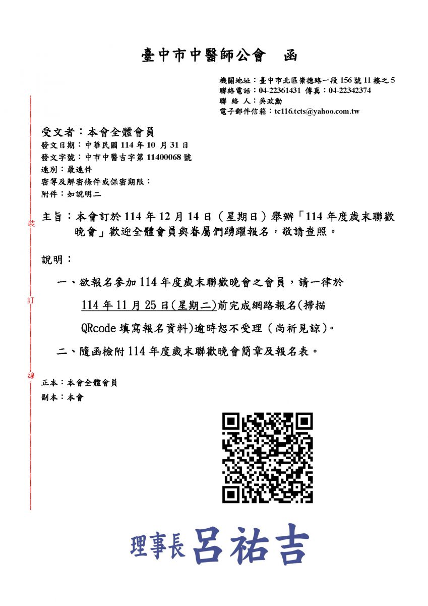 本會訂於114年12月14日(星期日)舉辦「114年度歲末聯歡晚會」歡迎全體會員與眷屬們踴躍報名,敬請查照。